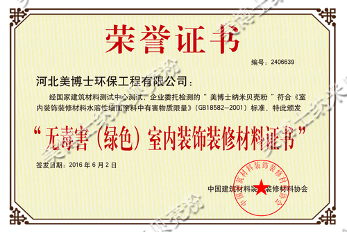 美博士經(jīng)國家建筑材料測試中心,企業(yè)委托檢測的“美博士納米貝殼粉”符合《室內(nèi)裝飾裝修材料水溶性墻面涂料中有害物質(zhì)限量》(GB18582-2001)標準,中國建筑材料裝飾裝修材料協(xié)會于2016年6月2日特此頒發(fā)了“無毒害(綠色)室內(nèi)裝飾裝修材料證書”
